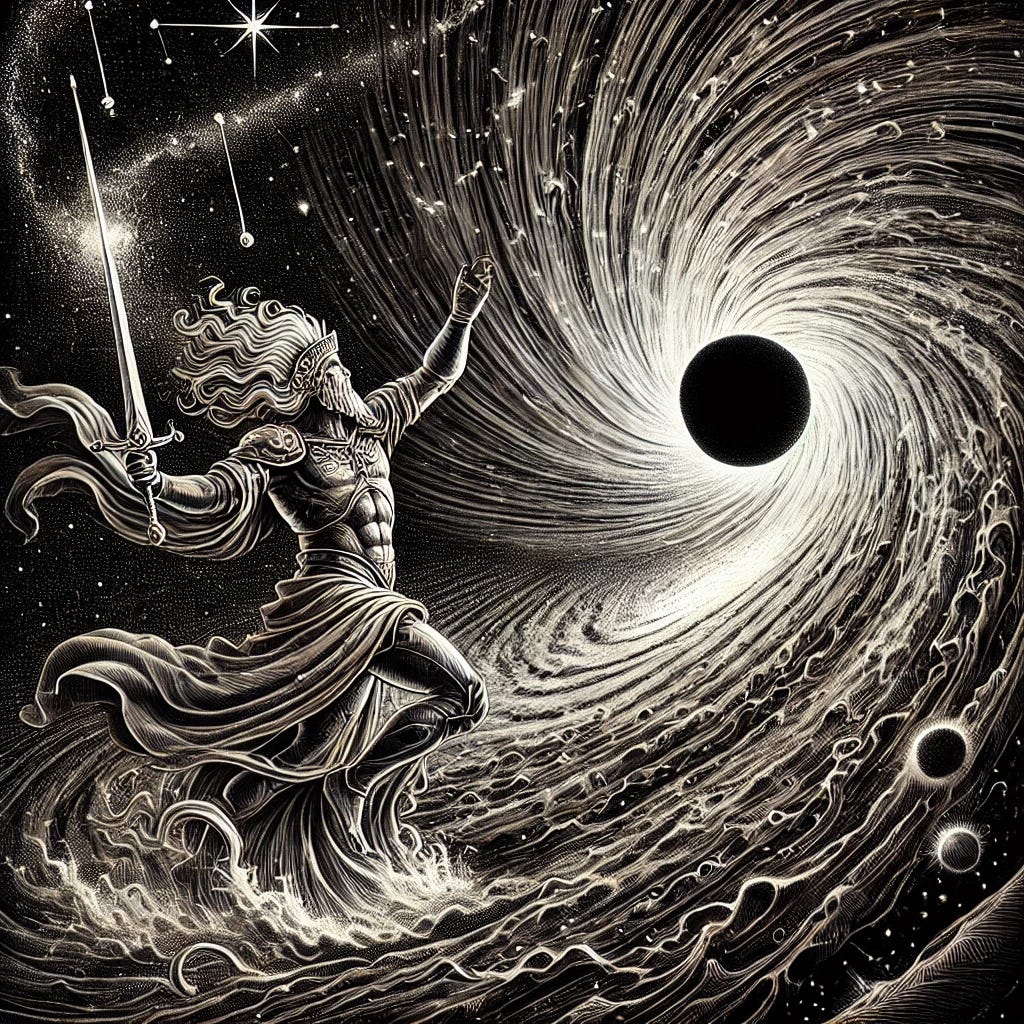 The illlustration shows Orion, the hunter, spiralling towards a black hole. A cataclysm — but not yet.